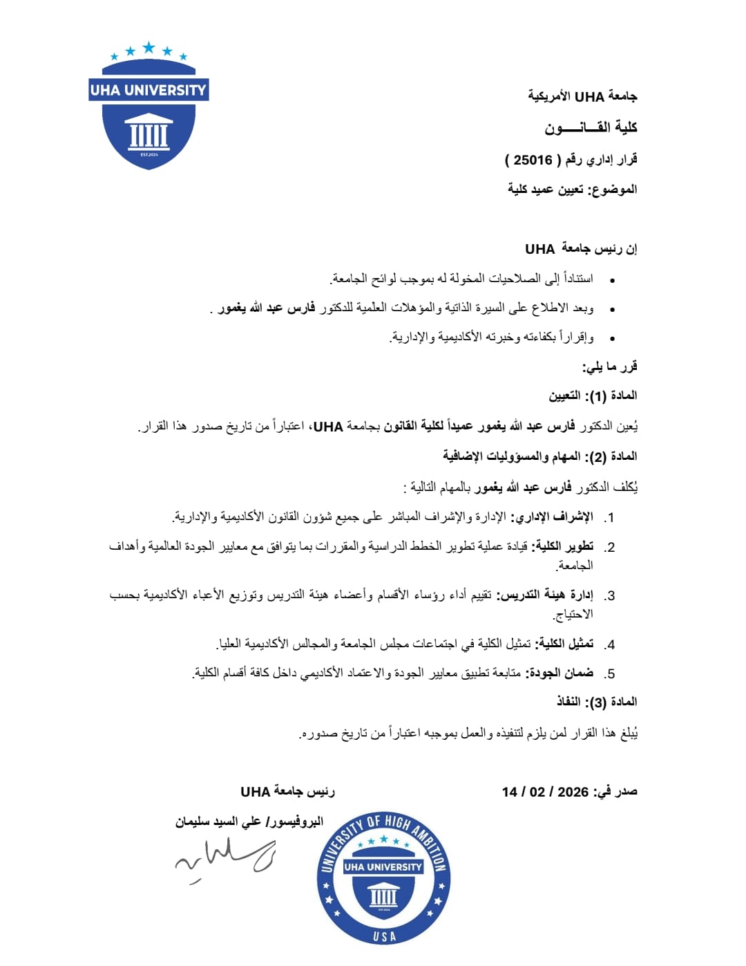 تعلن جامعة UHA عن تعيين د. فارس عبدالله يغمور عميدًا لكلية القانون.