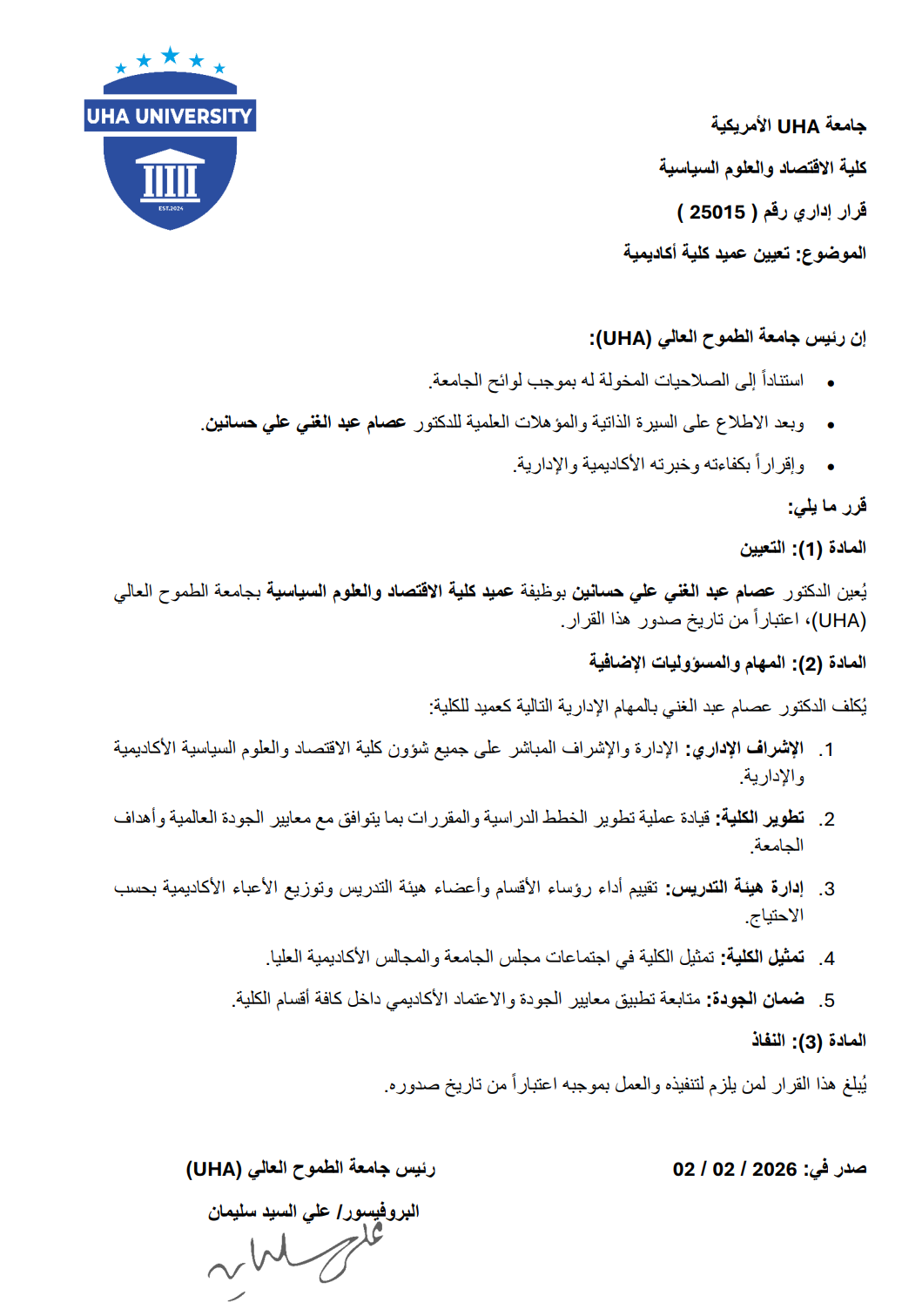 أصدر رئيس جامعة الطموح العالي (UHA)، البروفيسور علي السيد سليمان، قرارًا إداريًا بتعيين الدكتور عصام عبد الغني علي حسانين عميدًا لكلية الاقتصاد والعلوم السياسية، وذلك اعتبارًا من تاريخ صدور القرار، استنادًا إلى الصلاحيات المخولة له ووفقًا للوائح الجامعة. ويأتي هذا القرار تقديرًا للكفاءة الأكاديمية والخبرة الإدارية للدكتور عصام عبد الغني.